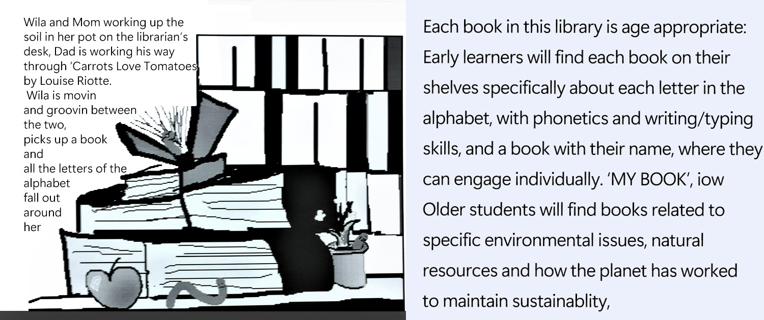 (she reaches for a book and letters of the alphabet fall out on the desk, each one a book in itself)